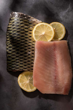 fresh fish fillet with ingredients for cooking, top view. home cooking, dietary fish meat