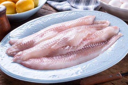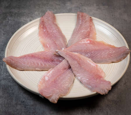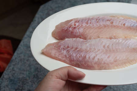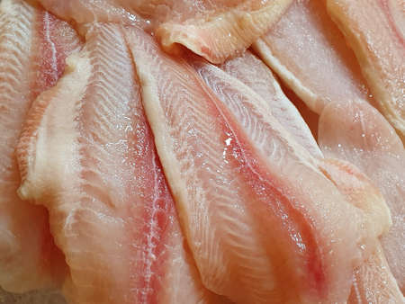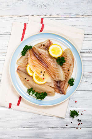 Whitefish Tilapia Fish Raw Fillet on White Wooden Background. Selective focus.