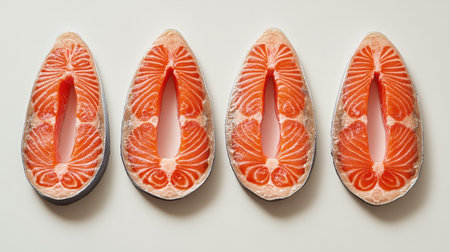 A collection of fresh salmon slices displayed on a light background, ideal for cooking or preparation. Perfect for healthy meals, recipes, and culinary projects.