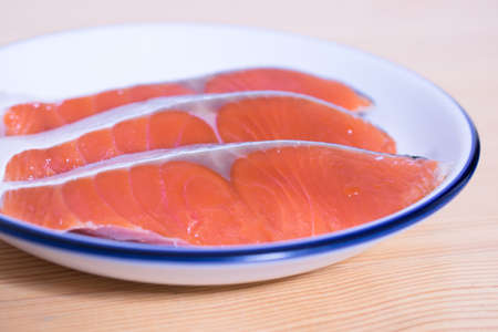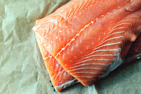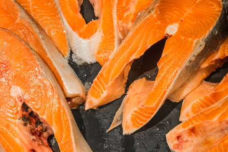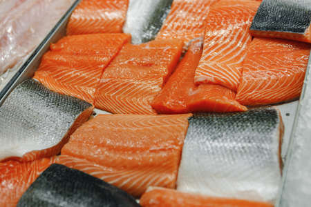 Raw salmon steak fish fresh seafood on supermarket counter background.