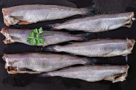 Raw headless gutted carcasses of redfish also known as ocean perch on the dish on the rustic table, top view
