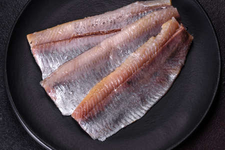 Delicious fresh herring fillet with salt, spices and herbs on a black plate against a dark concrete background