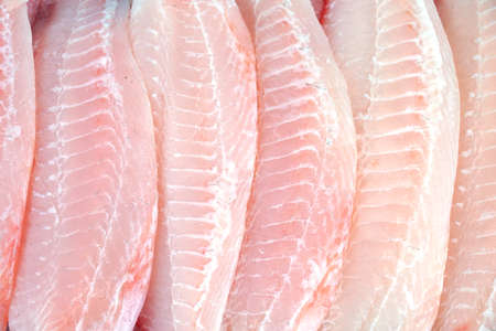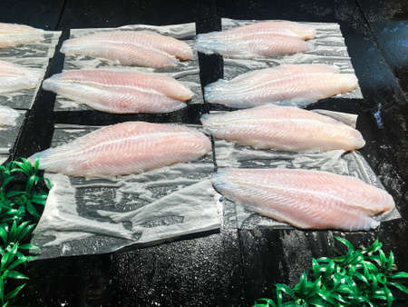 Fresh fish fillet put up for sale in a supermarket refrigerator