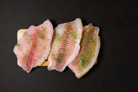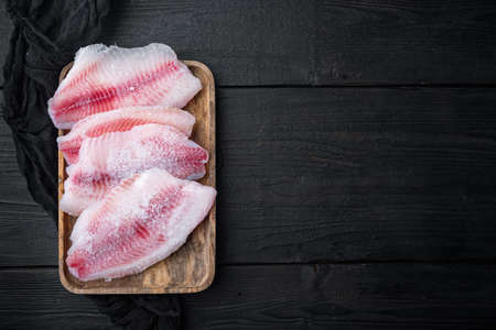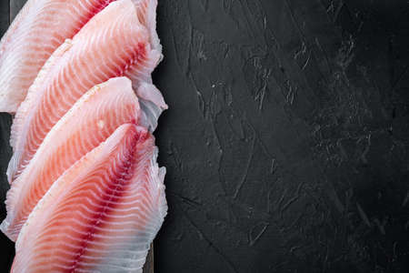 Tilapia fish fillet meat cuts, on black background, top view with copy space for text