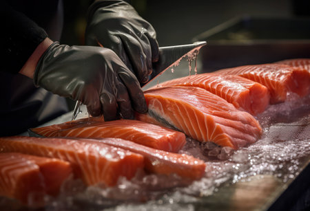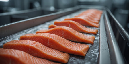 AI Generated. Fresh salmon fillets being processed on conveyor belt in factory