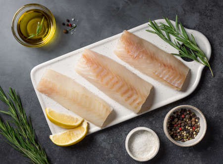 Frozen, white fish fillet, on black wooden background, top view with copy space for text