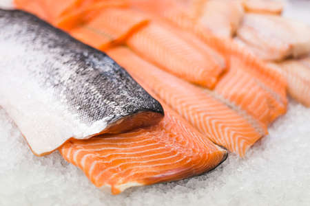 salmon cool fish in ice. sea food. grocery shopping. soft focus