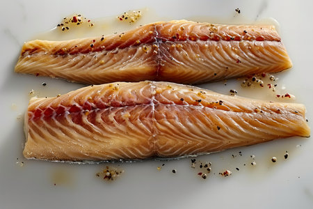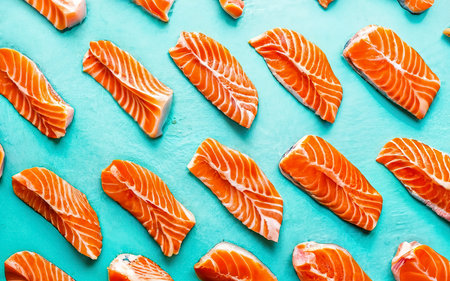 This image showcases vibrant raw salmon fillets, perfectly arranged to highlight their stunning marbling and rich color, ideal for culinary use.