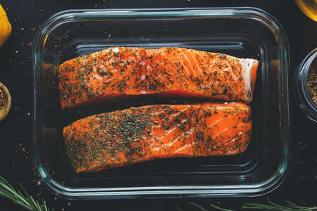 Raw salmon pieces with spices and dill on lunch box. View from above.