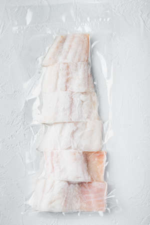 Raw haddock fish skinless plastic vacuum packaged, on white background, top view