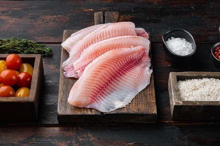 Raw white fish tilapia, with basmati rice and cherry tomatoes ingredients, on dark wooden background, top view with copy space for text