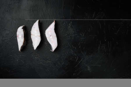 Frozen raw fish steak set, on black dark stone table background, top view flat lay, with copy space for text