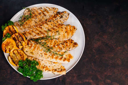 Fresh raw fillet of tilapia fish with thyme, rosemary, lemon. food preparation