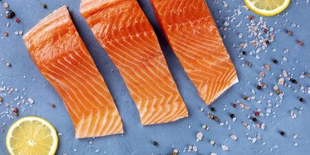 High stack of raw salmon fillets, healthy fat source, pescatarian diet