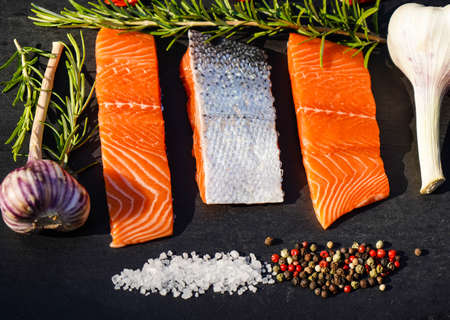 Fresh salmon trout fillet with herbs spices and salad for bbq