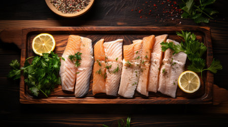 fresh salmon is beautifully presented on a wooden board, adorned with dried herbs and lemon slices. the composition features smooth and curved lines, creating a visually appealing multi-layered effect. the image is enhanced with split toning, showcasing vibrant colors. captured in 32k uhd resolution, this photograph is reminiscent of the artistic styles of serge marshennikov and aleksandr deyneka, with its striped pattern adding an interesting