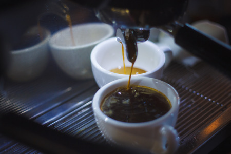 Hot coffee flow into a cup on espresso machine. Clouseup photo.