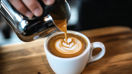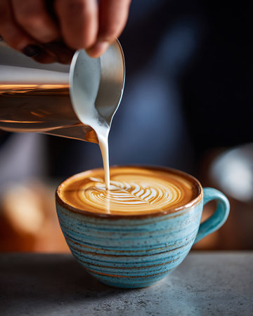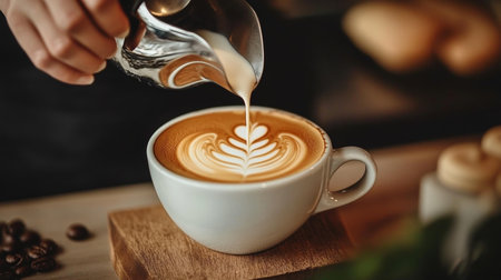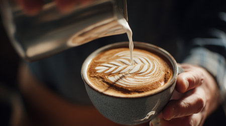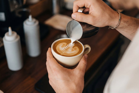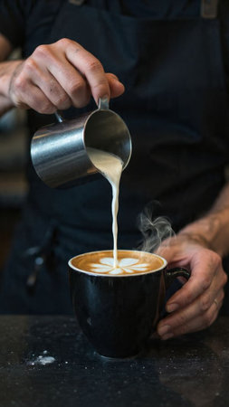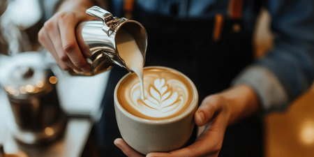 Barista pouring creamy milk into a cup of coffee, skillfully crafting an intricate latte art design with heart and floral patterns