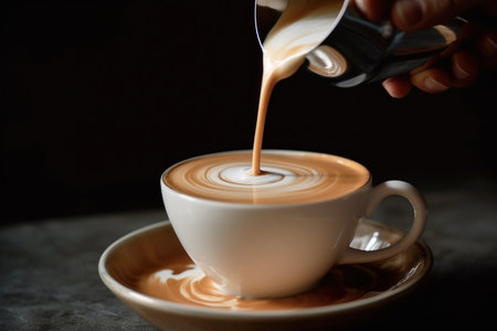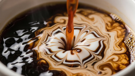 Pouring Creamy Milk into Rich Dark Coffee to Create a Delicious Cappuccino with Swirls