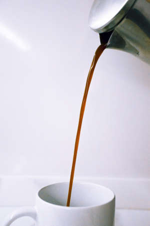 Stream of coffee brown liquid being poured into a cup from a coffee maker