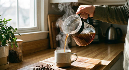 Hand Pouring Hot Coffee from Glass Server into Ceramic Mug on Sunny Morning