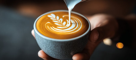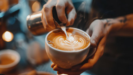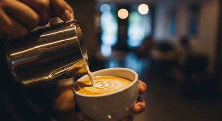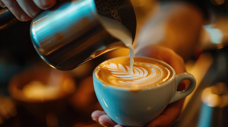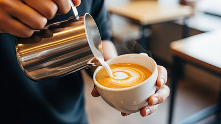 A barista's hands skillfully pour frothed white milk into a coffee cup, creating intricate latte art in a warm cafe setting with a blurred background
