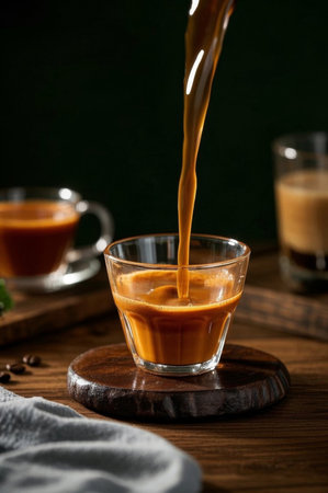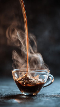 pouring coffee in a double glass mug, motion blur and soft focus close up
