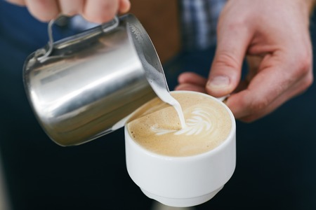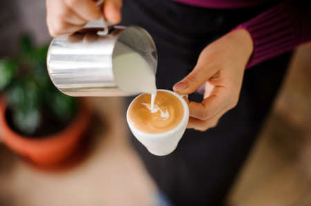 Barista draws milk over a coffee - making latte art for cappuccino