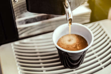 Cafe coffee service concept. Close-up of pouring espresso from a coffee machine. The coffee machine prepares coffee in a restaurant.