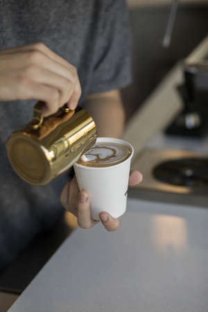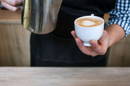 Barista pouring milk for prepare cup of coffee, latte art, Coffee preparation and service concept
