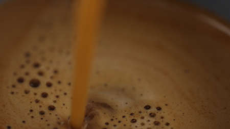 Coffee being poured into a glass creates foamy bubbles, a close up.