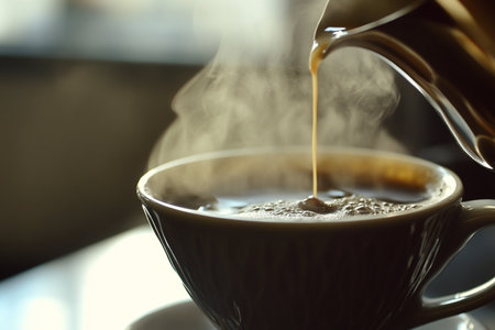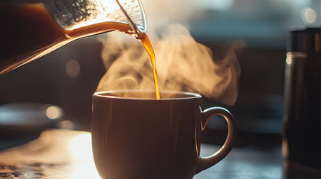Hot coffee being poured into a mug, steam rising gently from the dark liquid, early morning vibe