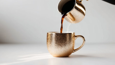 AI Generated. Pouring hot coffee into a golden glittery mug