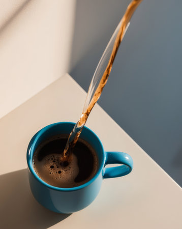 AI Generated. Freshly brewed coffee pouring into a blue mug