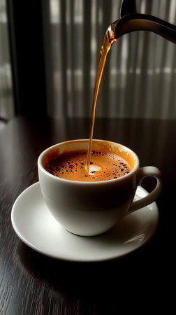 Coffee is being poured into a white cup, creating a rich, aromatic liquid. The warm light adds a cozy atmosphere, perfect for starting the day.