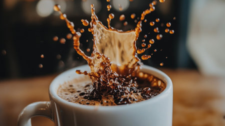 A white coffee cup overflowing with rich brown coffee as splashes rise dramatically, symbolizing energy and excitement.