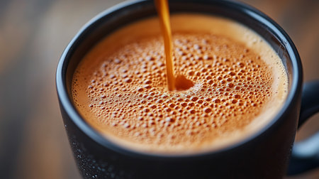 close up of coffee being poured into a black mug, showing foam and bubbles on the liquid surface