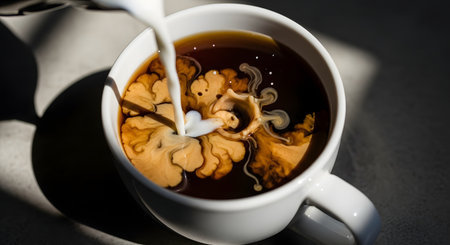 An overhead view captures milk pouring into a coffee-filled cup, creating dynamic swirls. The image showcases contrasting colors and textures with a clean, minimalist style. The lighting is soft, suggesting a studio setting. This visual is suitable for commercial uses, including advertising and editorial content.