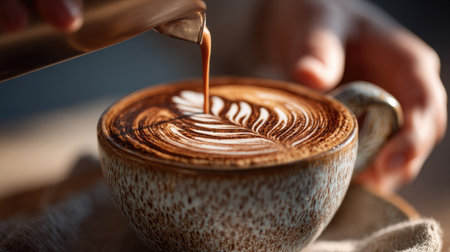 Captivating close-up of a beautifully crafted latte art featuring a floral design, served in a rustic cup, embodying warmth and comfort in a cozy cafe.