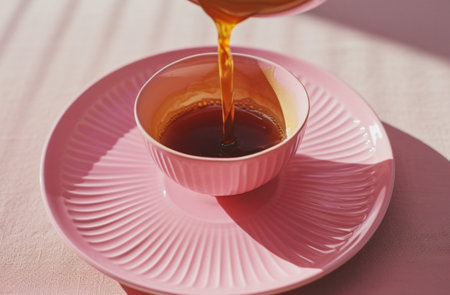 close up coffee pour on pink plate on table.