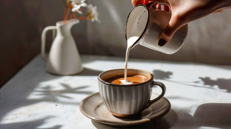 A woman's hand pours cream into a cup of coffee. AI generated.