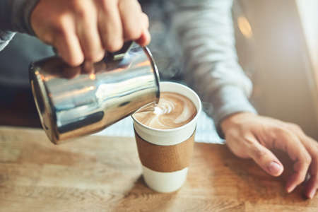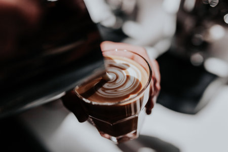 A barista pouring cream into a cappuccino glass making a beautiful coffee art