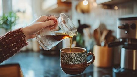 A womans hand holding a glass pourover as she pours slow coffee into a rustic mug, with the calm ambiance of a modern kitchen behind her.