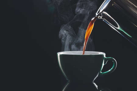 Pouring of hot coffee in cup on dark background