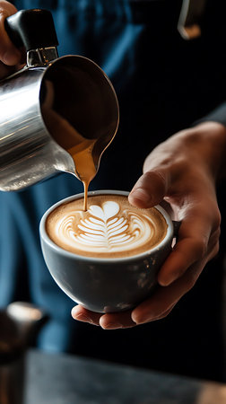 Artisan Barista Crafting Beautiful Latte Art in a Cozy Modern Cafe with Freshly Brewed Coffee