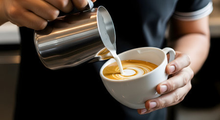 Close-up shot of a barista's hands skillfully pouring steamed milk from a metal pitcher into a ceramic cup, forming intricate latte art on the surface of a coffee drink.