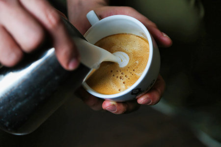 Barista pouring milk in cappuccino coffee in coffeeshop