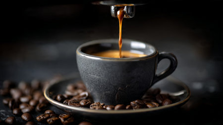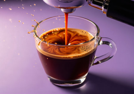 Fresh espresso pouring from a machine into a glass cup, creating a dynamic splash and crema swirl