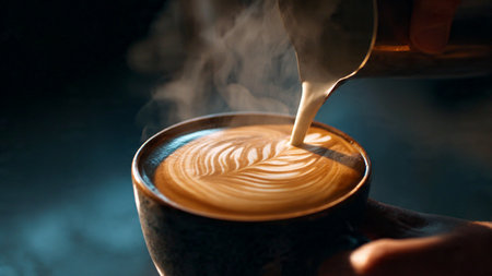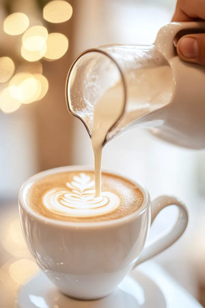 Craft Beverage Cafe Scene with Warm Coffee Pour, Creamy Milk, and Beautiful Latte Art Design
