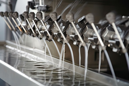 Close-up of beverage production line with industrial equipment. Generative AI.